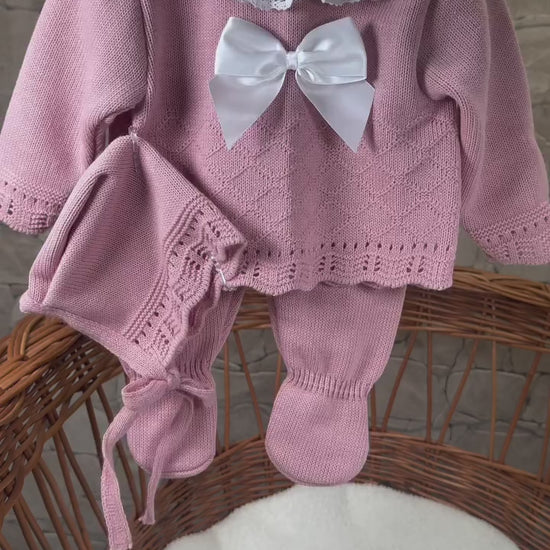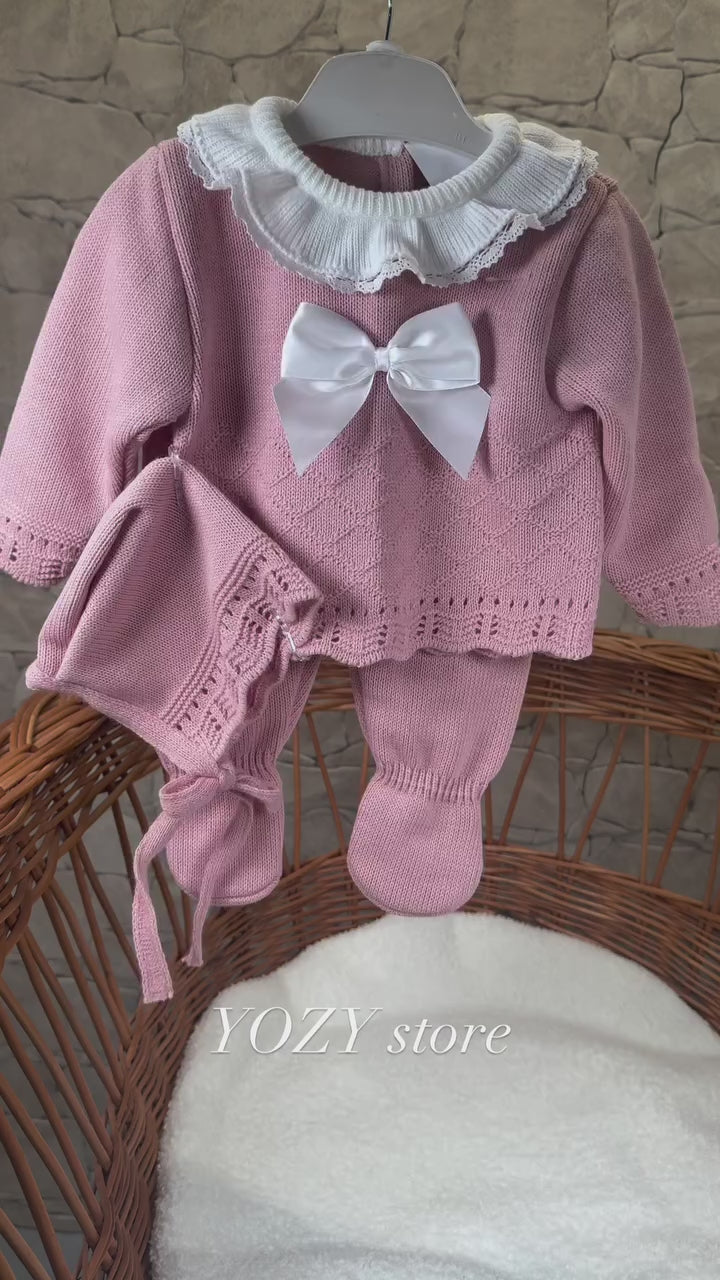 Ensemble naissance fille de 3 pièces en rose, doux et confortable pour bébé. Hypoallergenique, ce set est un musthave dans le dressing de votre bébé pour la maternité. Fabriqué de manière éthique et respectueuse de l'environnement, il convient à toutes les saisons pour bébé (0-3 mois).